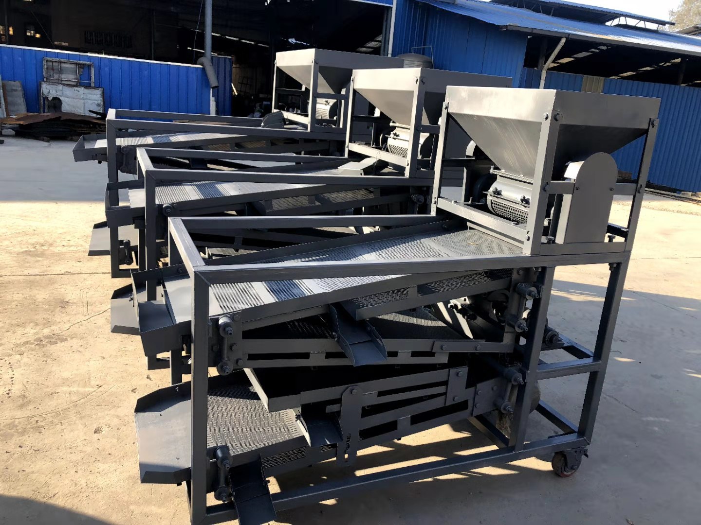 原枝花椒投進(jìn)料斗后--------粉碎裝置將原枝花椒進(jìn)行粉碎,將枝葉殼籽分別剝離下來--------通過下料器一起落到篩面上進(jìn)行分離篩分---------一層將篩出來的是大枝干、梅花椒、石子,復(fù)試篩網(wǎng)篩出來的是花椒枝--------二層篩出來的是花椒籽,椒籽出來的地方有風(fēng)機(jī),將里面輕的雜質(zhì)篩選出來-------三層是為篩分椒枝設(shè)計(jì),整層篩出來都是花椒枝------底層篩出來的是花椒殼,復(fù)試篩網(wǎng)是塵土雜質(zhì)等。